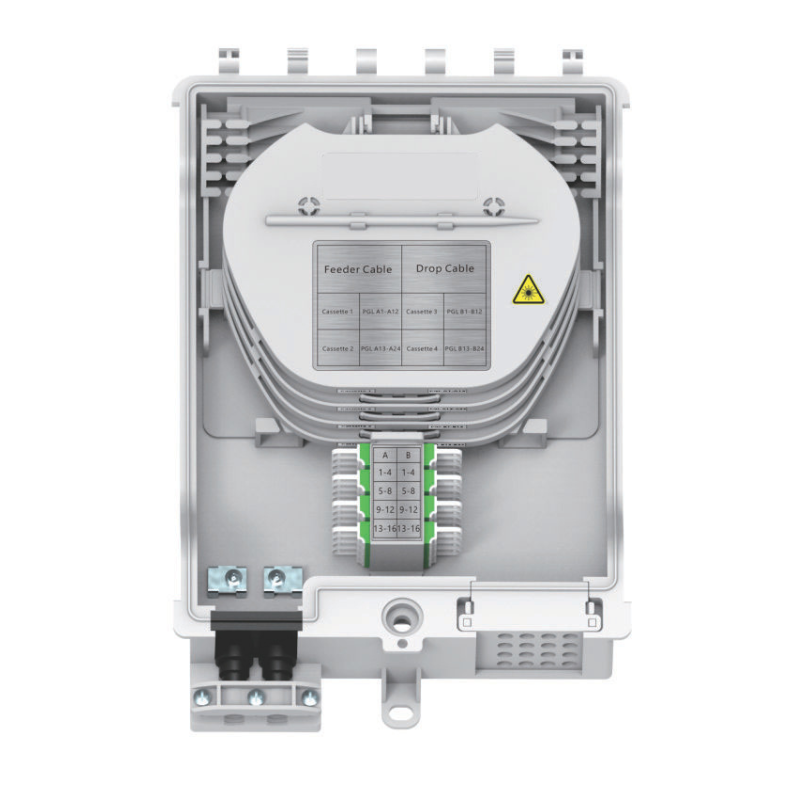 Engineered for both indoor and outdoor installations, this distribution point provides robust protection while maintaining flexibility across a wide range of network architectures. Its intelligently designed internal layout supports structured fibre routing, splitter integration and secure cable management, ensuring fast, consistent and professional installations.