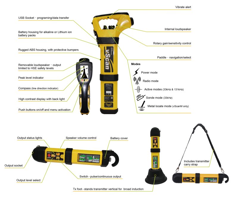 - Modes: Power mode, Radio mode, Active modes (33kHz & 131kHz), Sonde mode (33kHz), Metal locate mode (vScanM only)